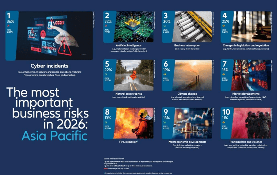 The corporate risk landscape in Asia Pacific has undergone a fundamental shift in 2026. While the physical disruption of supply chains dominated boardrooms in the post-pandemic years, the primary threats to business continuity have now migrated almost entirely to the digital realm. According to the latest Allianz Risk Barometer, Cyber incidents remain the most formidable challenge for companies in the region, but it is the meteoric rise of Artificial Intelligence that defines the new era of corporate vulnerability.