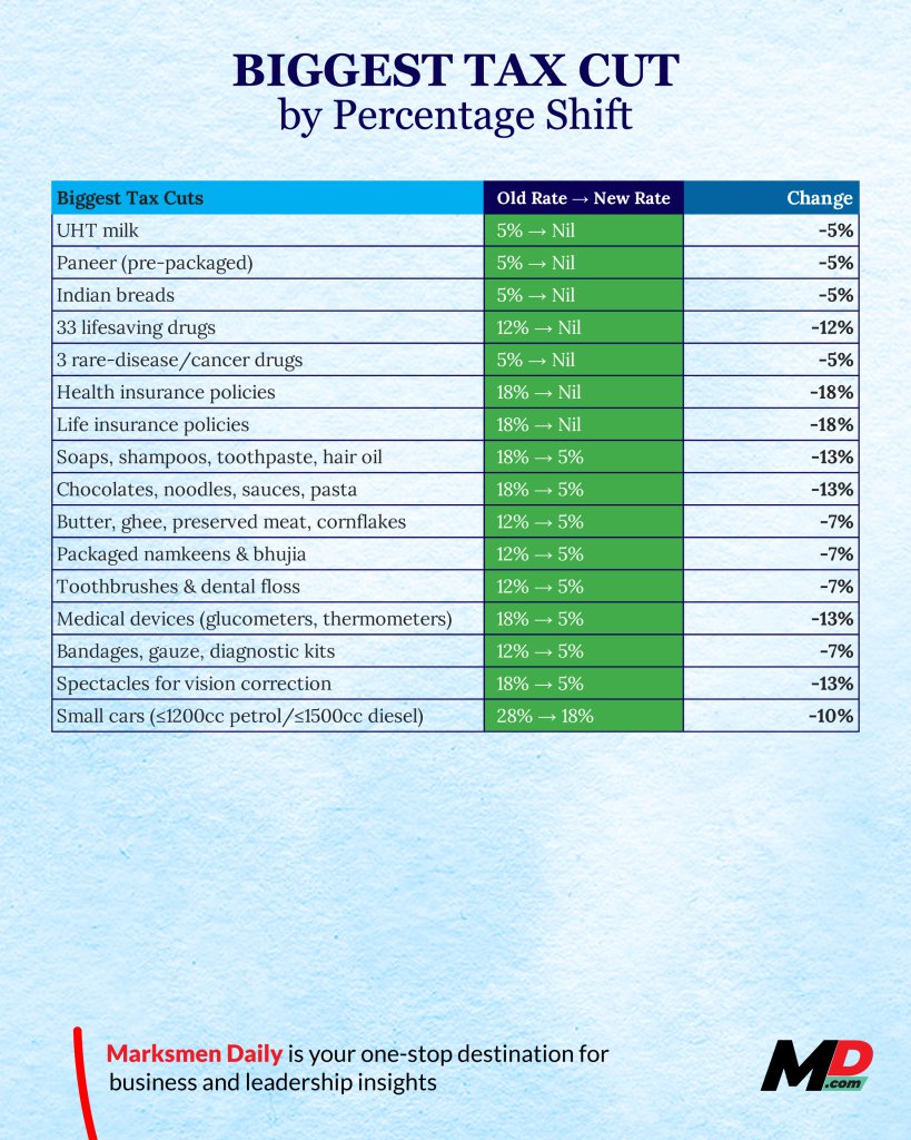 At first glance, the reliefs look generous. Essentials like milk, paneer, and Indian breads such as roti and paratha are now entirely free of tax. A basic grocery basket—soap, toothpaste, shampoo, biscuits, chocolates, noodles—moves to the lower 5 percent slab. Health and life insurance policies, once taxed at a prohibitive 18 percent, are now GST-free. Lifesaving drugs are exempt as well, with most other medicines down to 5 percent. These are changes that touch the everyday lives of Indians, whether in the kitchen or the hospital ward.