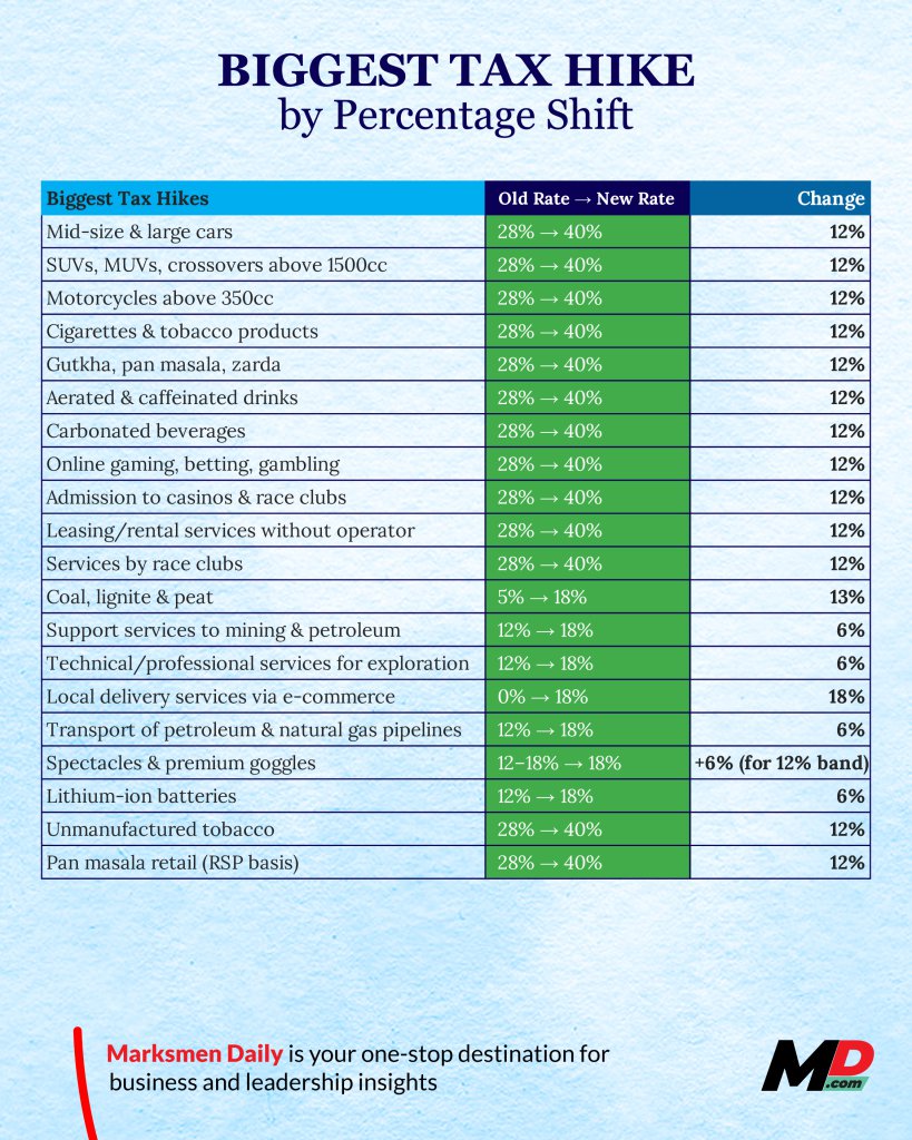 The sharpest hikes are on coal (+13%) and online delivery services (+18%, because they were zero-rated before). The sharpest cuts are on insurance (-18%) and many consumer staples/medical goods (-7% to -13%).