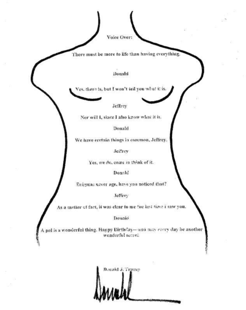 The note, part of a professionally bound birthday book gifted to Epstein on his 50th birthday in 2003, shows a typewritten message accompanied by a crude illustration of a naked woman. At the bottom, a wavy signature reads “Donald,” positioned below the waist to resemble pubic hair. It is worth noting that the human form depicted appears to be that of a child.