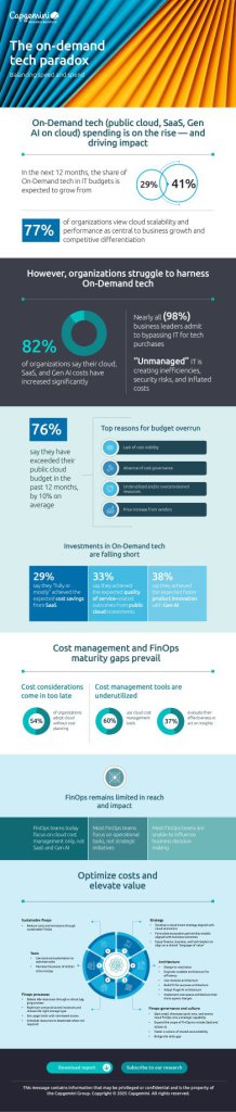 As digital transformation accelerates across industries, organizations are embracing On-Demand technologies — such as public cloud, Software-as-a-Service (SaaS), and Generative AI (Gen AI) — to scale innovation, improve agility, and support competitiveness. But while the benefits are clear, a new global study from the Capgemini Research Institute published today, ‘The On-Demand tech paradox: balancing speed and spend’, reveals that rising costs, complexity, and governance gaps are putting returns at risk. With growing demand for digital infrastructure, organizations are struggling to contain technology costs due to lack of cost visibility, underutilized resources, as well as a legacy mindset.