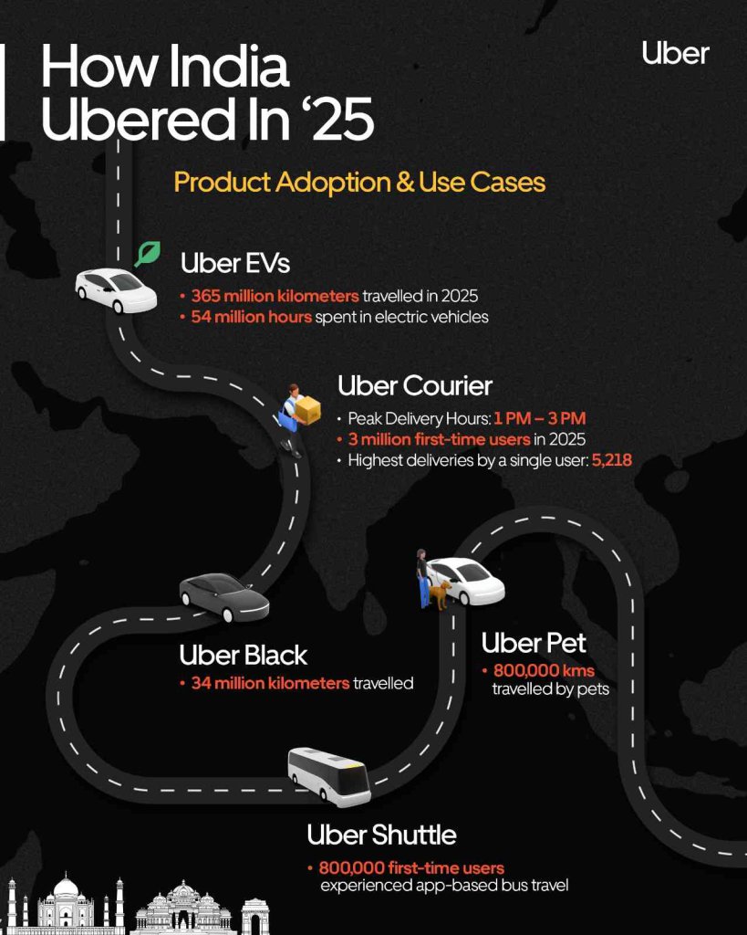 Uber’s mass and premium mobility offerings continued to see strong adoption during the year. Indians travelled 365 million kilometers in Uber EVs in 2025, spending a total of 54 million hours in electric vehicles, reinforcing the shift towards greener mobility choices.